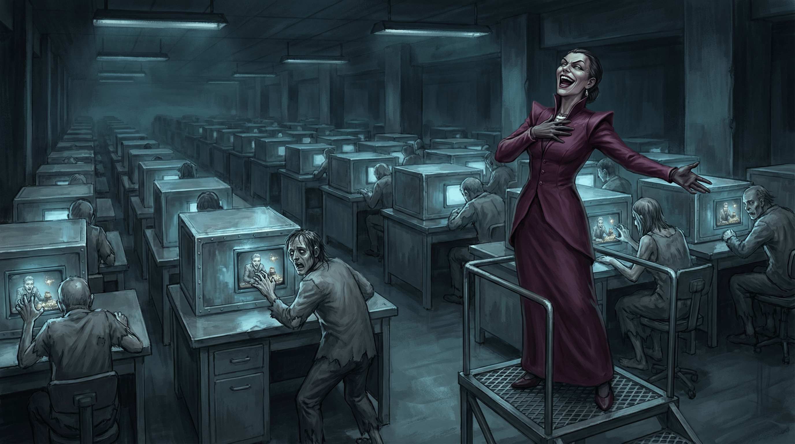 “We invented the most magical, wonderful device humanity has ever witnessed: The Sucker. It’s a device that displays images of your ideal self so you can be inspired to greatness. I come from the city of Hollowland, in the east. We are a technical race but I was getting...bored there. So I brought my greatest invention to Wingnut and you can see the progress so far. I mean, these people are positively rioting! All of these people, from the King and Queen to the lowliest cobbler, are witnessing what they could be. They gave up their businesses so they could join us, a most noble choice if you ask me. And yes, we do collect a fee for using these machines, but as you can see, it’s for the betterment of all.” She fondly rubbed the shoulder of a man who was screaming, looking madly at a picture of himself, buff, tan and surrounded by treasures. Drabelia gazed in horror at the man, suddenly realizing it was the King himself. These “workers” weren’t employees, but rather, sickened customers.