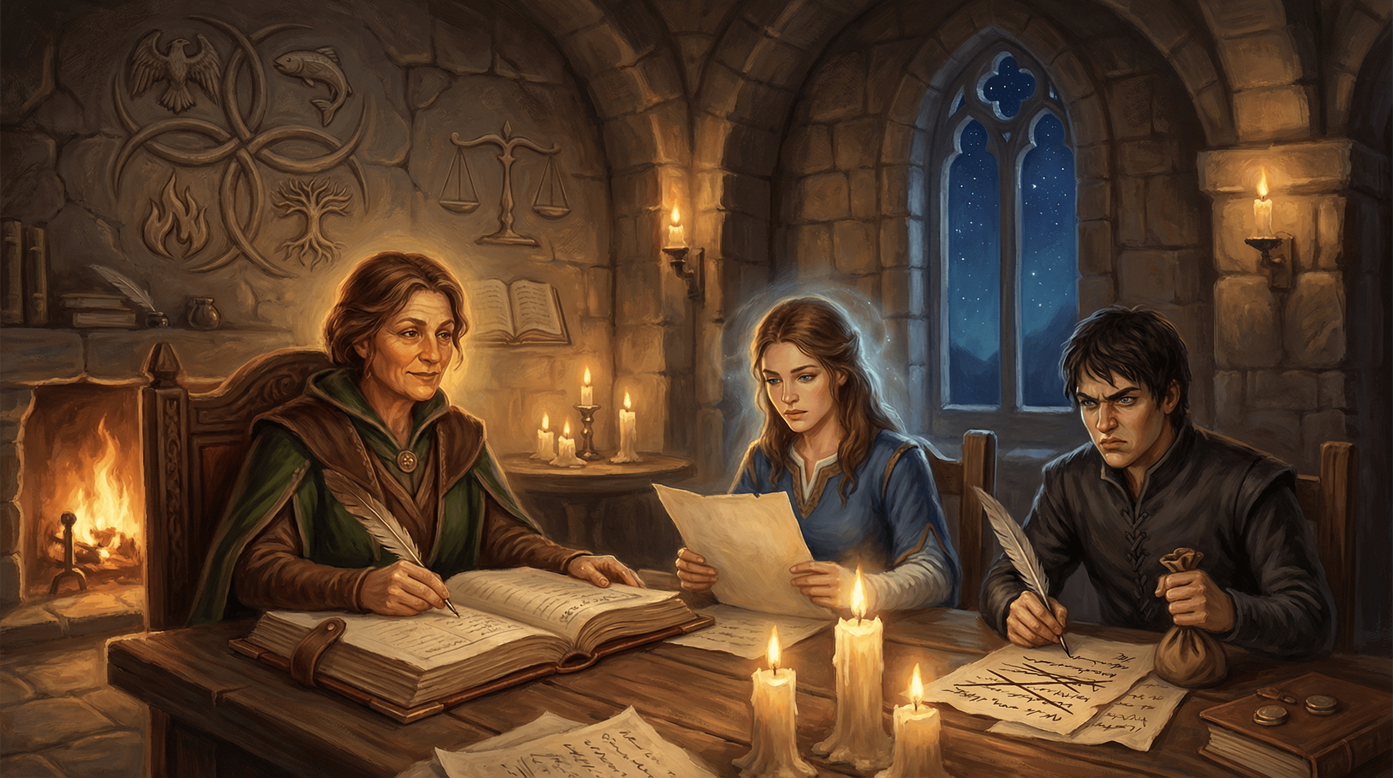 “Oh, there’s no need for raising your voice, dear Drabelia,” said the woman dryly. “You’re here to work, after all.” She looked pointedly at a desk in the middle of the room - there were a few papers and pencil shavings scattered on it.
